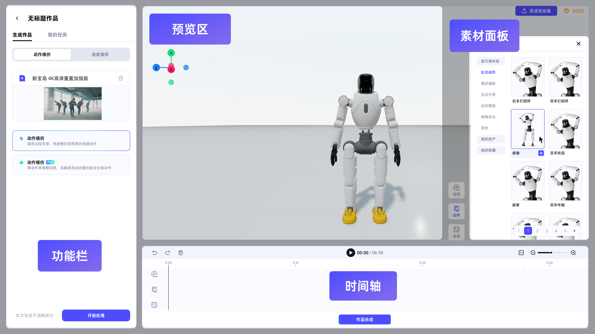为了提升用户创作“机器人故事片”的能力,「灵创」平台打造了动作混剪、组合与故事线编排功能,帮助用户做“导演”,让用户像剪视频一样,完成长程表演中的叙事化动作设计。