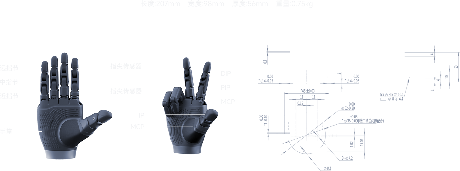 四指弯曲:80°,四指侧摆:±10°,大拇指弯曲:50°,大拇指侧摆:90°,大拇指自旋:50°